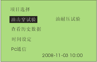 7 通过旋转鼠标可以选择进行击穿试验,耐压试验,查看历史数据,时间设定和PC通信等操作项目。